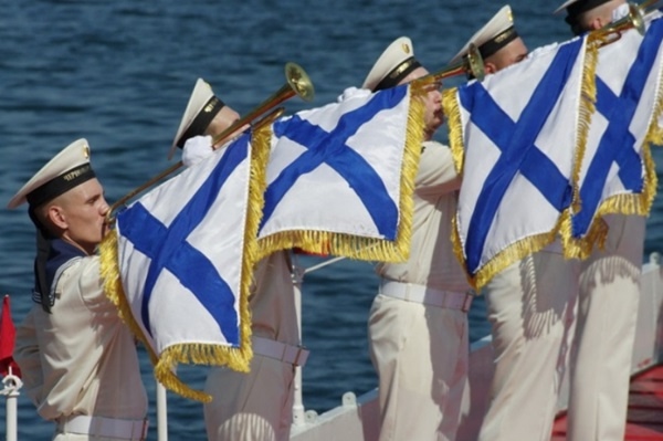 «В 1923 году был введён первый советский флаг ВМФ, созданный на основе военно-морского флага Японии: красный, с белым солнцем и лучами, в центре Звезда. Затем в 1935 году был утверждён более знакомый флаг с голубым полем, звездой, серпом и молотом, просуществовавший на флоте вплоть до конца советского периода. В 1992 году Андреевский флаг официально был восстановлен как флаг ВМФ РФ, с той лишь разницей, что крест был голубого цвета. А с 2001 года флаг флота вновь приобрёл традиционную сине- белую расцветку», — рассказал Максим Крот.